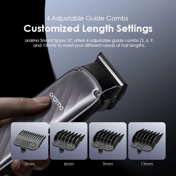 oraimo SmartClipper 2C offers 4 adjustable guide combs (3, 6, 9, and 13mm) to meet your different needs of hair lengths.